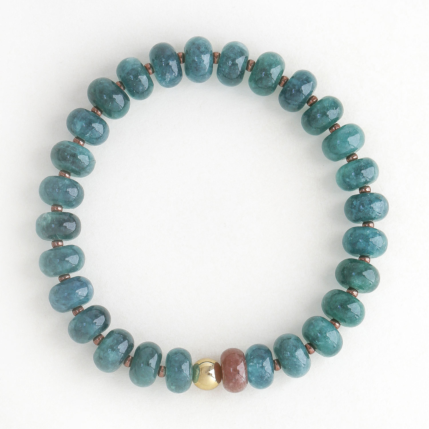 Gentle tones, chunky look & pure chic! Hochwertiges Armband aus gefärbter Jade in eleganten Grüntönen. Mit einer Akzentperle in erdigem Braun und einer goldigen Kugel als Highlight. Abgerundet wird das Design durch feine Miyuki-Beads. Elastisch, edel und vielseitig kombinierbar.