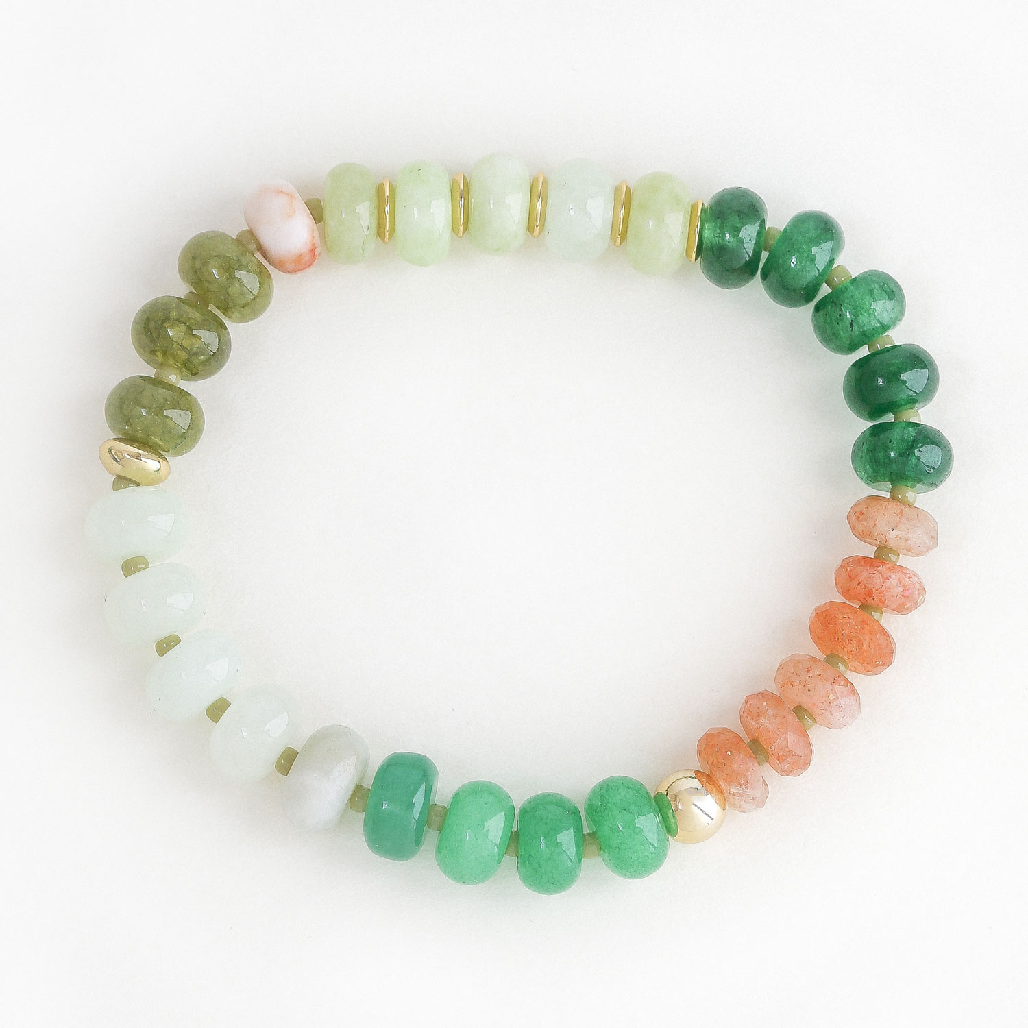 Chunky, trendy, irresistible! Ein Armband, das Natur und Eleganz perfekt vereint: grüne Jade-Perlen stehen für Harmonie und Balance, während der orangefarbene Sonnenstein mit seiner warmen Ausstrahlung Lebensfreude und Energie symbolisiert. Veredelt wird das Design durch feine goldfarbene Details Elastisch, edel und vielseitig kombinierbar. Chunky, farbige Armbänder sind gerade absolut im Trend.
