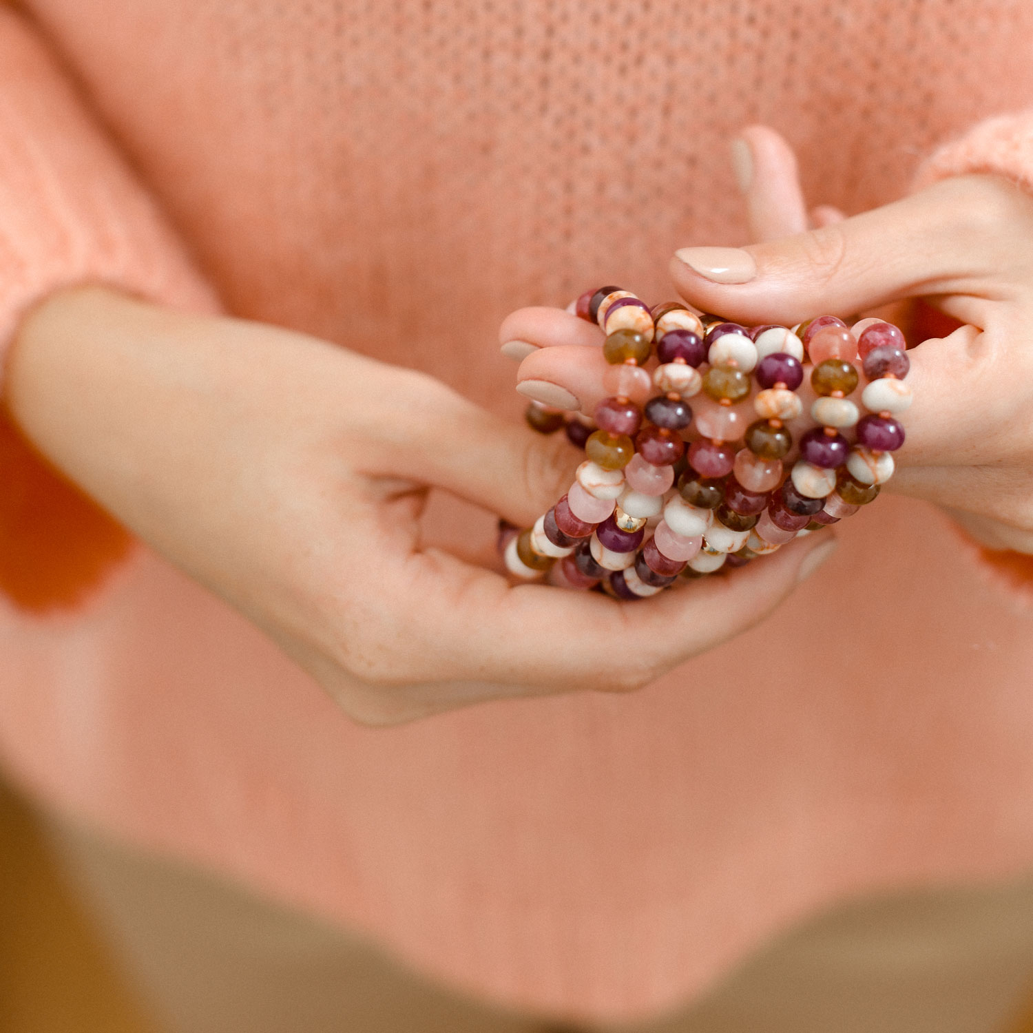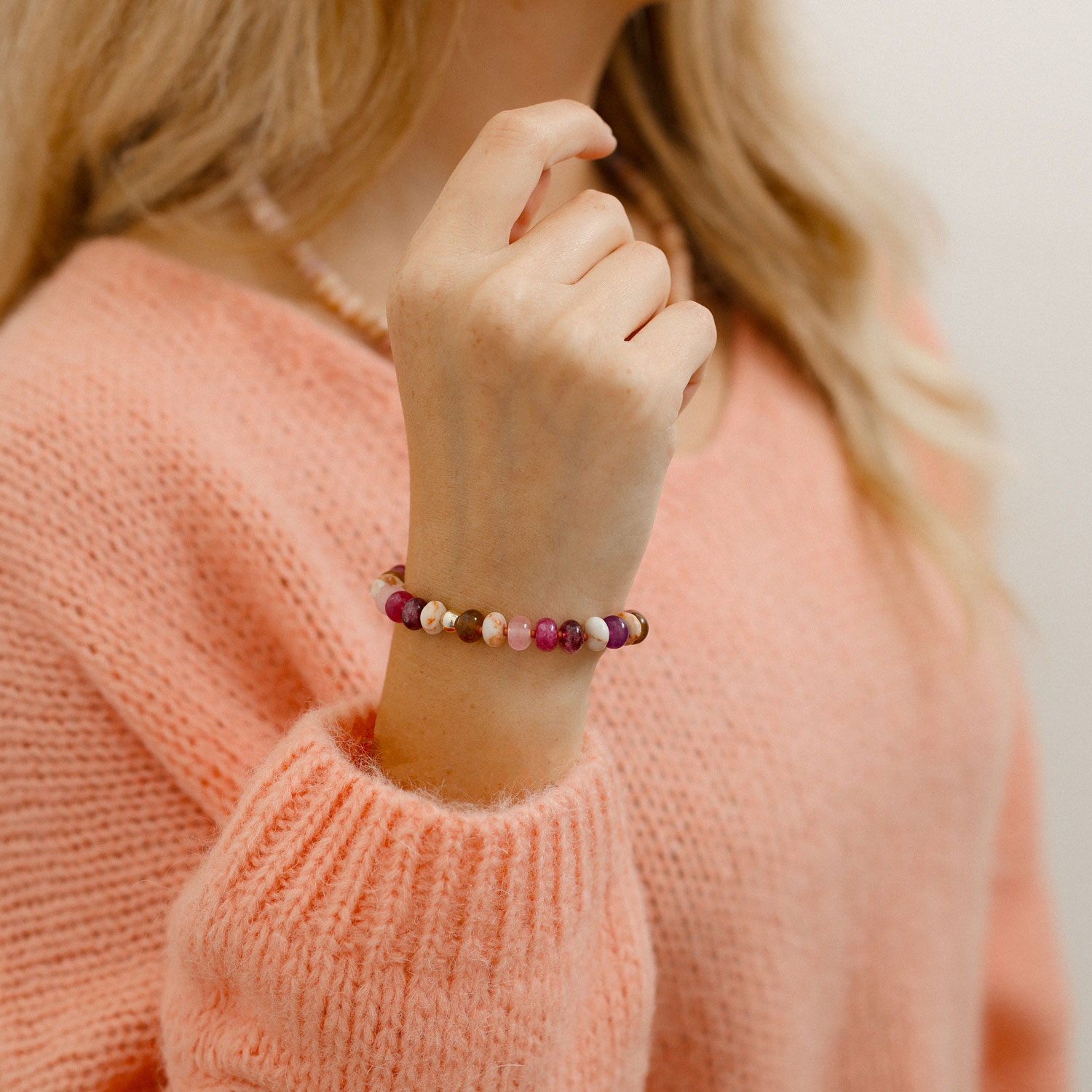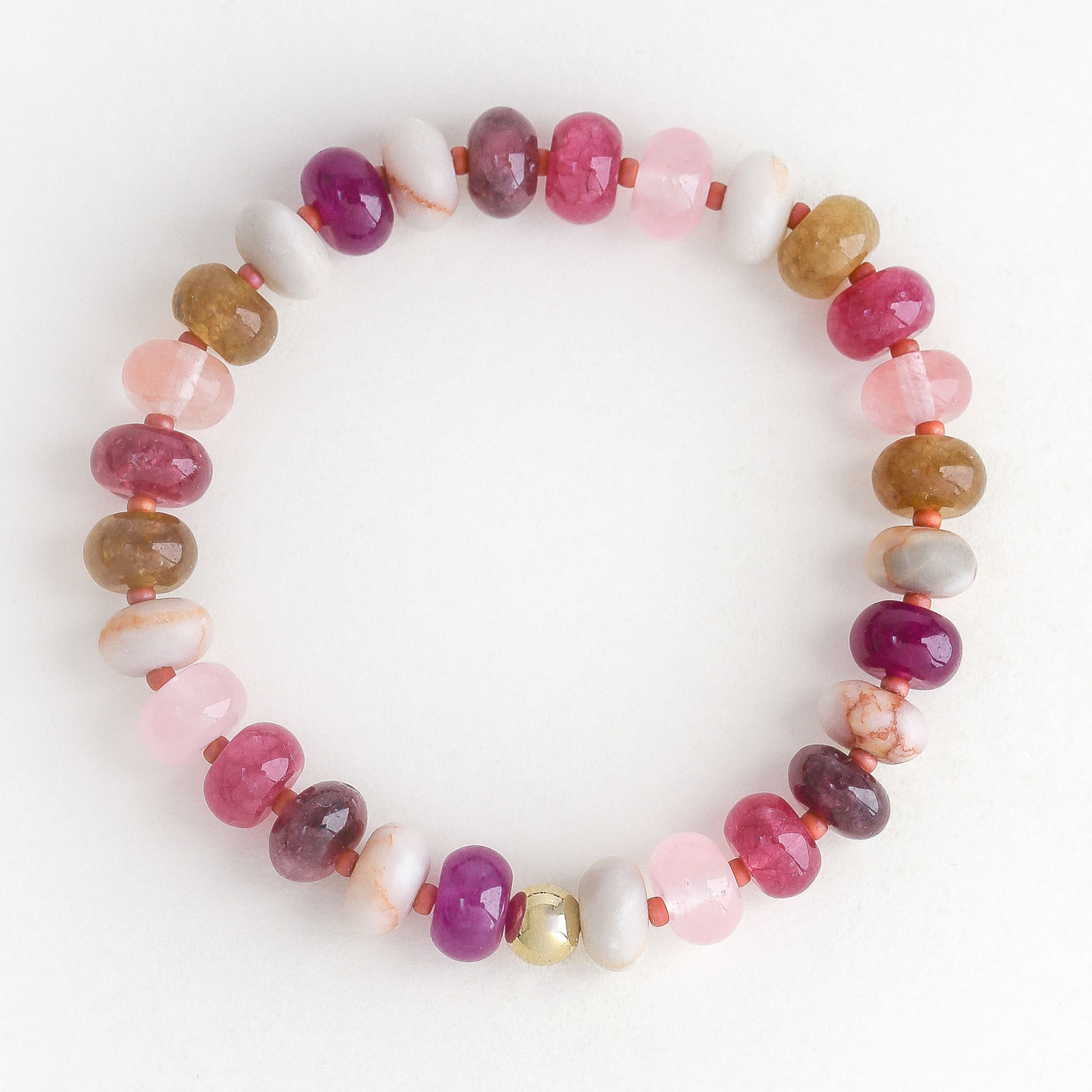 Playful colors, chunky design & timeless chic! Dieses elastische Armband kombiniert chunky gefärbte Jade-Perlen in harmonischen Farbverläufen von Beerentönen über Pink bis hin zu warmem Braun und zarten Hell-Nuancen. Abgerundet wird das Design durch feine Miyuki-Beads und ein goldenes Akzent-Element.