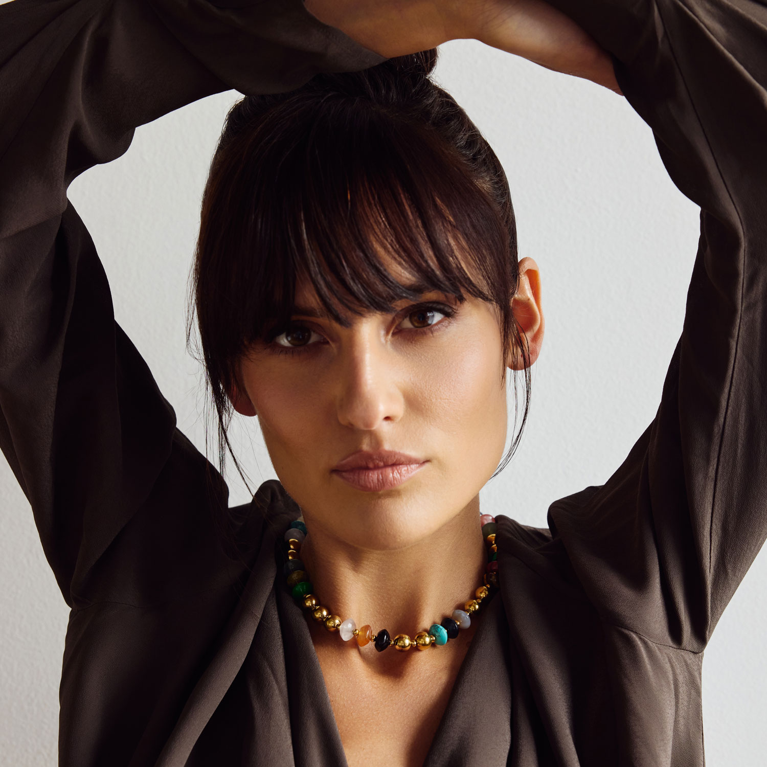 Eine trendige Halskette mit Halbedelsteinen, die stylische Akzente setzt und Farbe in jeden Look bringt. Die moderne Kombination aus leuchtenden Steinen und Edelstahl macht sie zu einem echten Hingucker, perfekt für den Alltag und besondere Outfits. Mit einer Länge von 40 cm und einer 5 cm Verlängerung lässt sie sich individuell tragen und easy kombinieren. Ein cooles Statement-Piece mit zeitlosem Charakter.