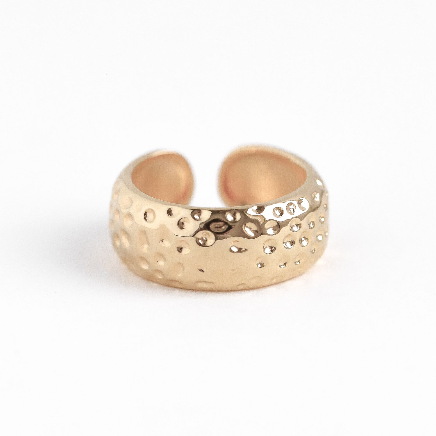 Dieser auffällige Statement-Ring aus 925er Silber, veredelt mit einer 18K-Gold-Vergoldung, beeindruckt durch sein ausdrucksstarkes Design. Der breite Ring mit seiner gehämmerten Struktur reflektiert das Licht auf besondere Weise und verleiht jedem Look einen einzigartigen Akzent. Ideal für selbstbewusste Schmuckliebhaberinnen, die ein klares Statement setzen möchten. Dank der offenen Form bietet der Ring einen angenehmen Tragekomfort und eine flexible One-Size-Passform, die sich an jede Hand anpasst. Ein echtes Highlight für jede Schmucksammlung.