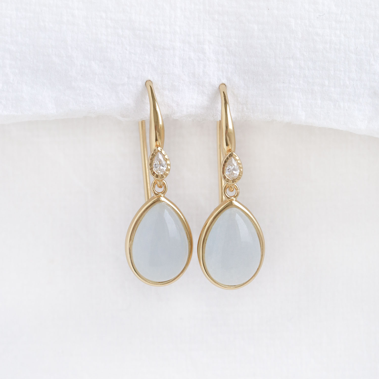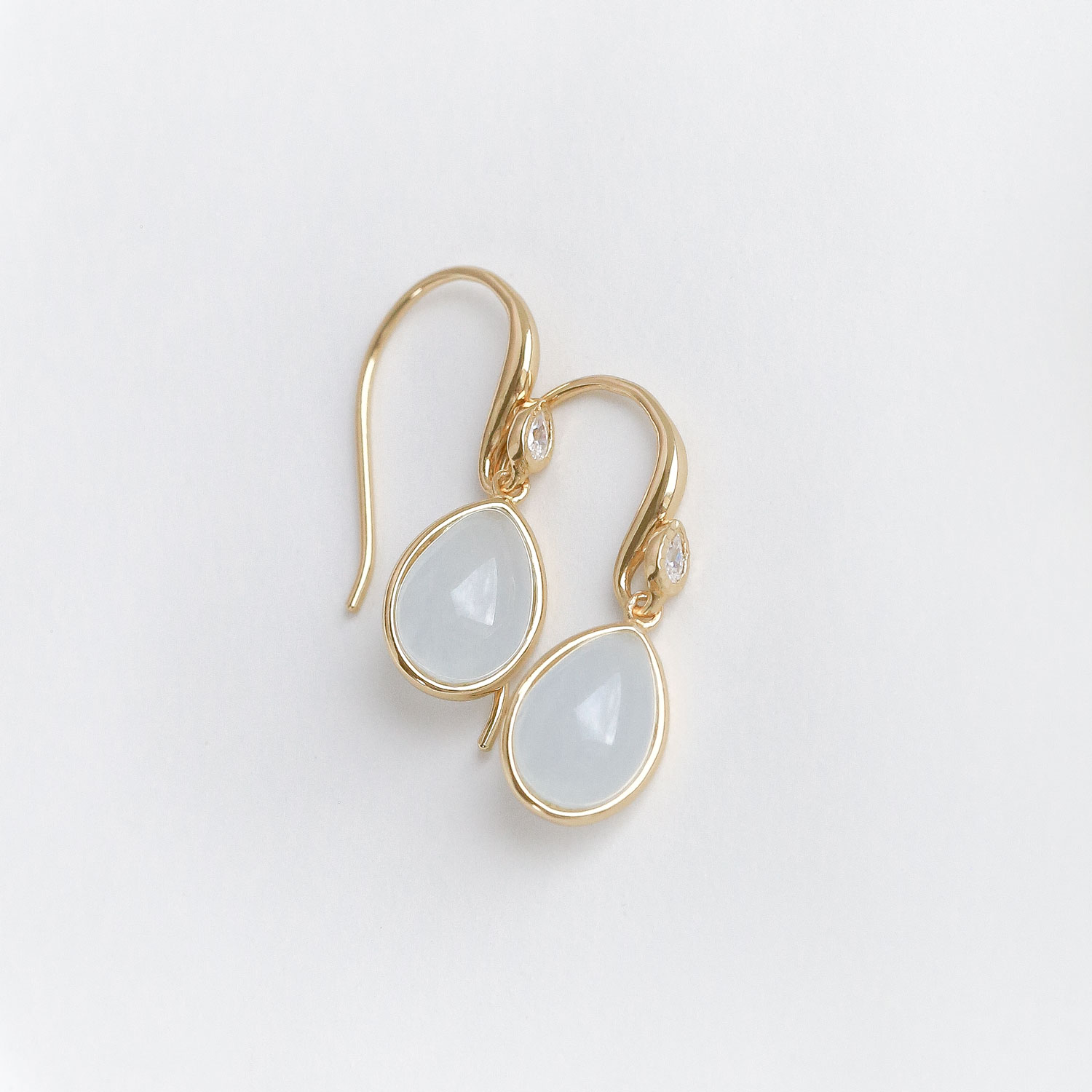 These elegant earrings are made of high-quality 18K gold-plated 925 silver and feature a teardrop-shaped blue quartz as the main stone. The soft blue hue of the quartz is complemented by a sparkling zirconia above it, adding a subtle, glamorous touch. The teardrop shape gives the earrings a feminine and stylish appearance, while the gold setting provides a luxurious finish. The earrings measure 2.7 cm in length.