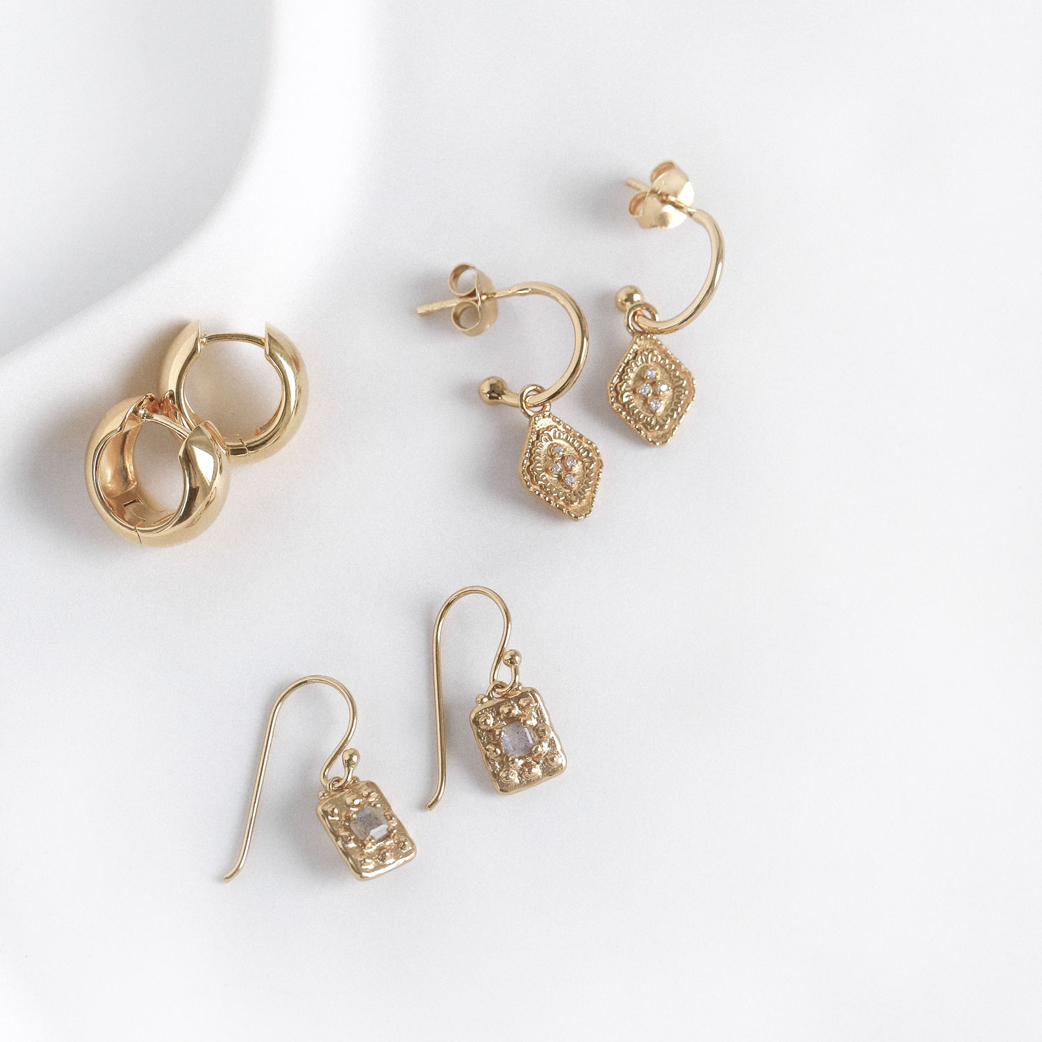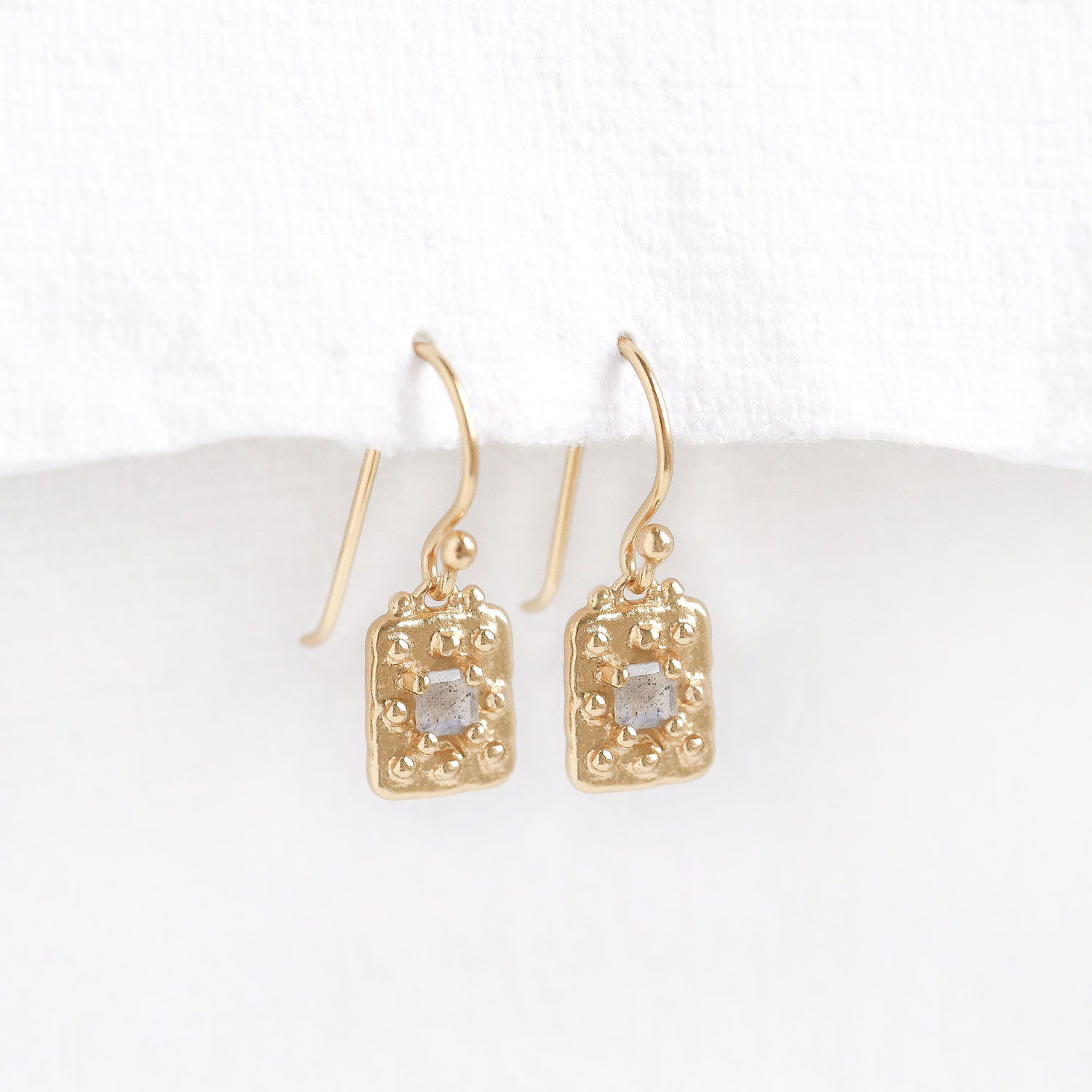 These stylish earrings combine timeless design with high-quality materials. Made from 18K gold-plated 925 silver, they feature a refined rectangular shape accented with a softly shimmering labradorite stone. The pendant length is 1 cm. These earrings are the perfect accessory to add an elegant yet natural touch to your look.