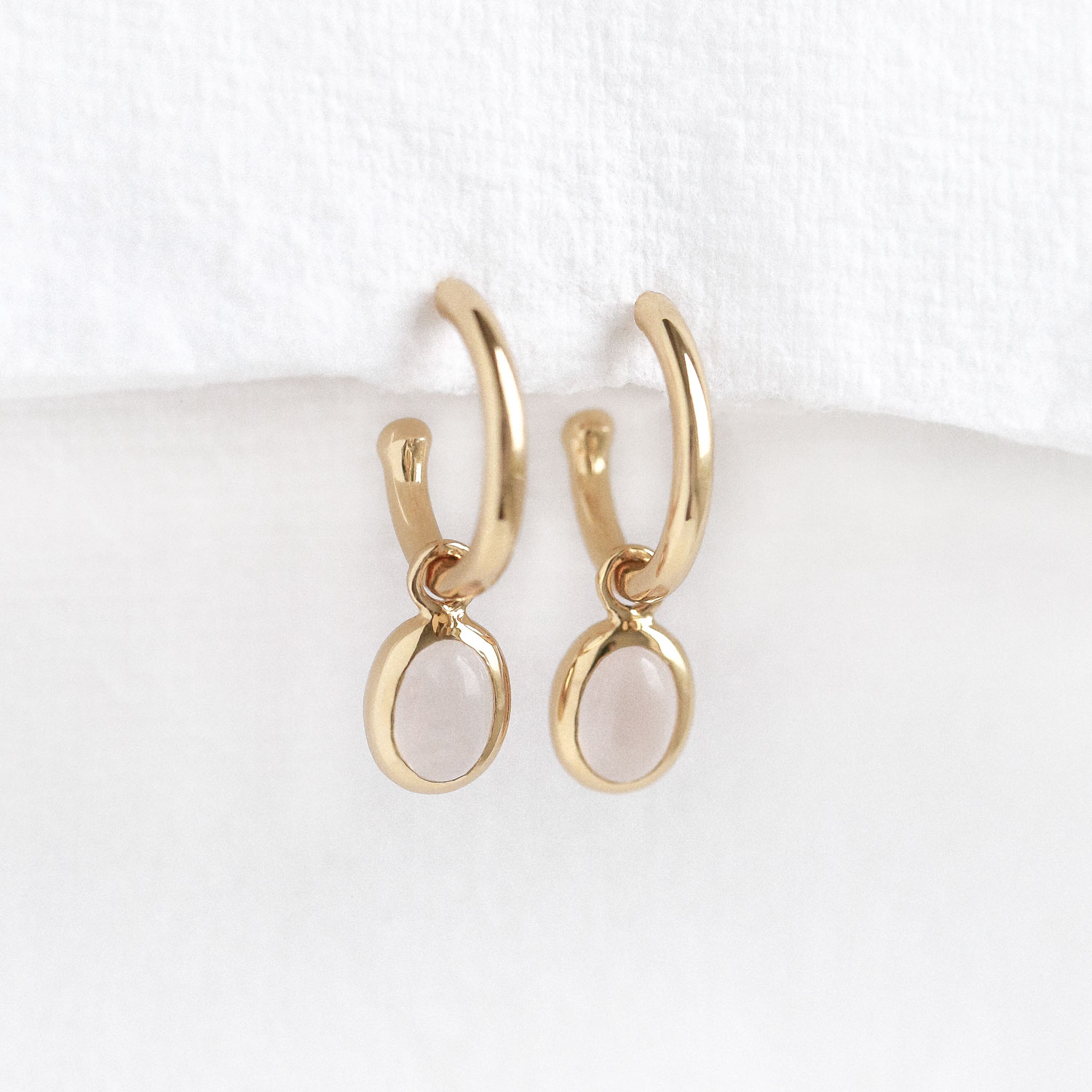 The ISA hoop earrings exude simple elegance and feminine beauty. Crafted from 925 silver and finished with 18K gold plating, these earrings are a timeless classic. The oval pendant made of delicate rose quartz adds a subtle touch of romance and harmony to your look, while the soft shimmer of the stone beautifully captures the light. The length of the earrings is 2.5 cm.