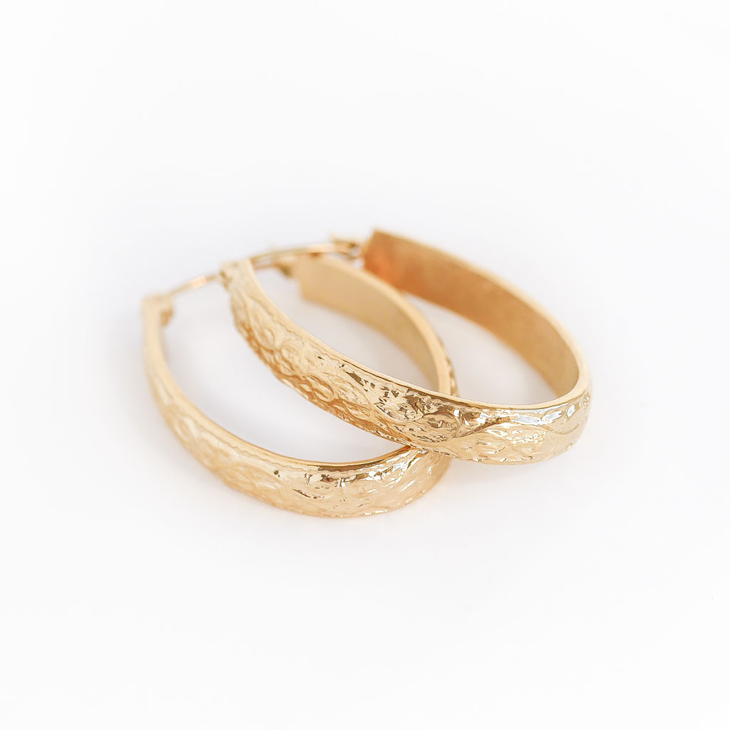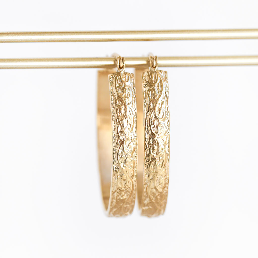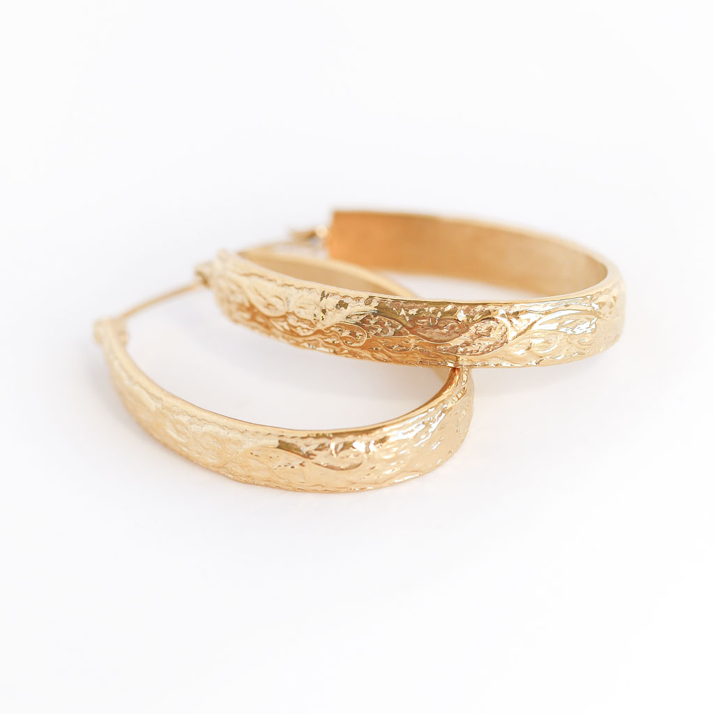 The Violetta Blues hoop earrings "Polly" are the perfect addition to any outfit. These elegant earrings are distinguished by their intricate floral pattern. This detailed design gives the earrings a luxurious yet trendy appeal. The warm gold tone and sophisticated design make them a timeless piece of jewelry that can be worn at both formal events and in everyday life. Thanks to the secure hinge mechanism, the hoop earrings always sit comfortably and securely on the ear. The hoops are oval and about 3cm long.
