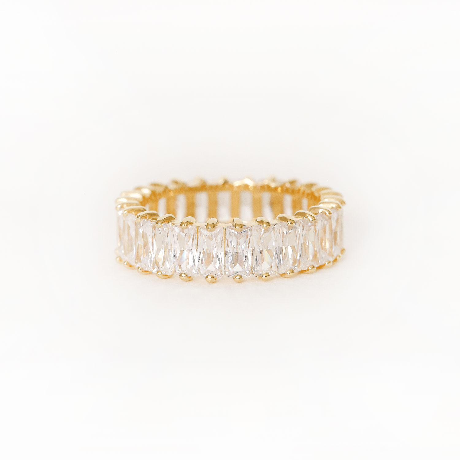 Make a radiant statement with this trendy NEW YORK GLOW ring. Crafted from high-quality 925 sterling silver plated with 18K gold, this piece combines luxurious shine with modern design. The clear zirconia stones, set all around, provide impressive brilliance and make the ring sparkle from every angle. The smooth inner surface ensures a pleasant and comfortable wearing experience.